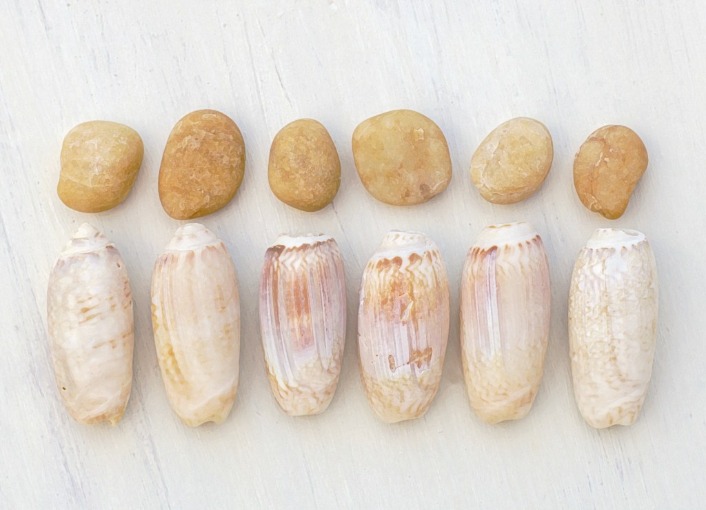 The family of Olive Sea Snails display shells that are typically smooth and shiny, except the one in my collection reveals thin brown groves over the exterior. The shells are typically bullet shaped coming to an apex point with three to five wide whorls. The bottom twists in my sample. The Olive Sea Snail family is large with many tropical species. Though, I am baffled about the specific species, it could be the purple olive sea snail (Callianax biplicata). While those are named for their frequent purple or violet tint, they are highly variable in color and can appear in shades of tan, grey, white, or light brown.