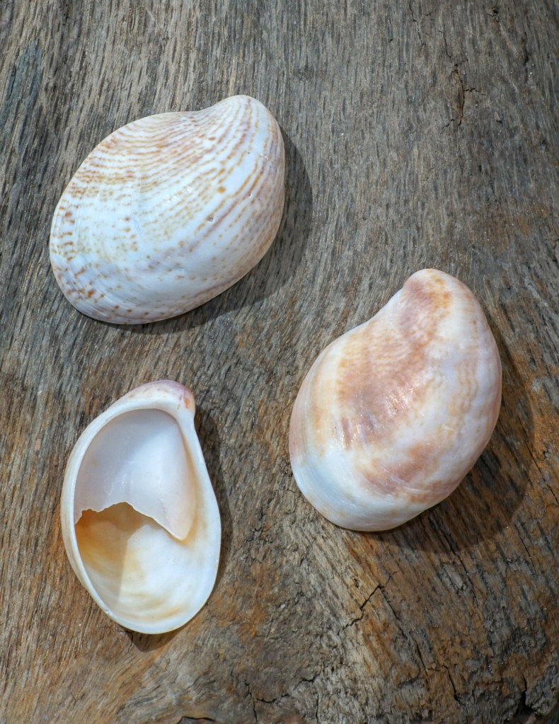 Atlantic Common Slipper sea snail shells display a creamy white background and curved chestnut-colored stripes variously placed. The inside is shiny and sometimes colored brown. The shell is thin and translucent, with an oval or boat shape. There is a shelf or “seat” in the hinge end, which resembles the stern seats on a boat or put all together, a slipper.