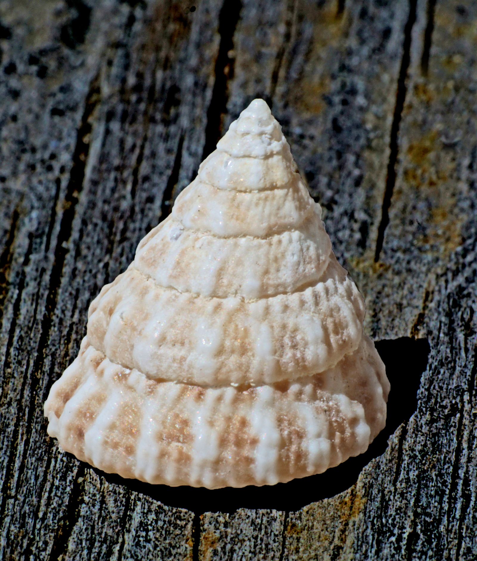 The Pearl Top shell displays cream colored stunning iridescence, prized for their mother of pearl glow. The shell is thick, conical in shape with a sharp spire displaying 8 to 10 whorls. The base is flat showing numerous circular ridges.