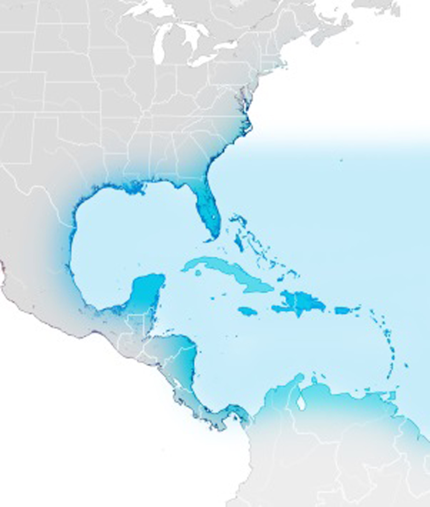 • Range: North Carolina to Florida, the Caribbean and Gulf of Mexico