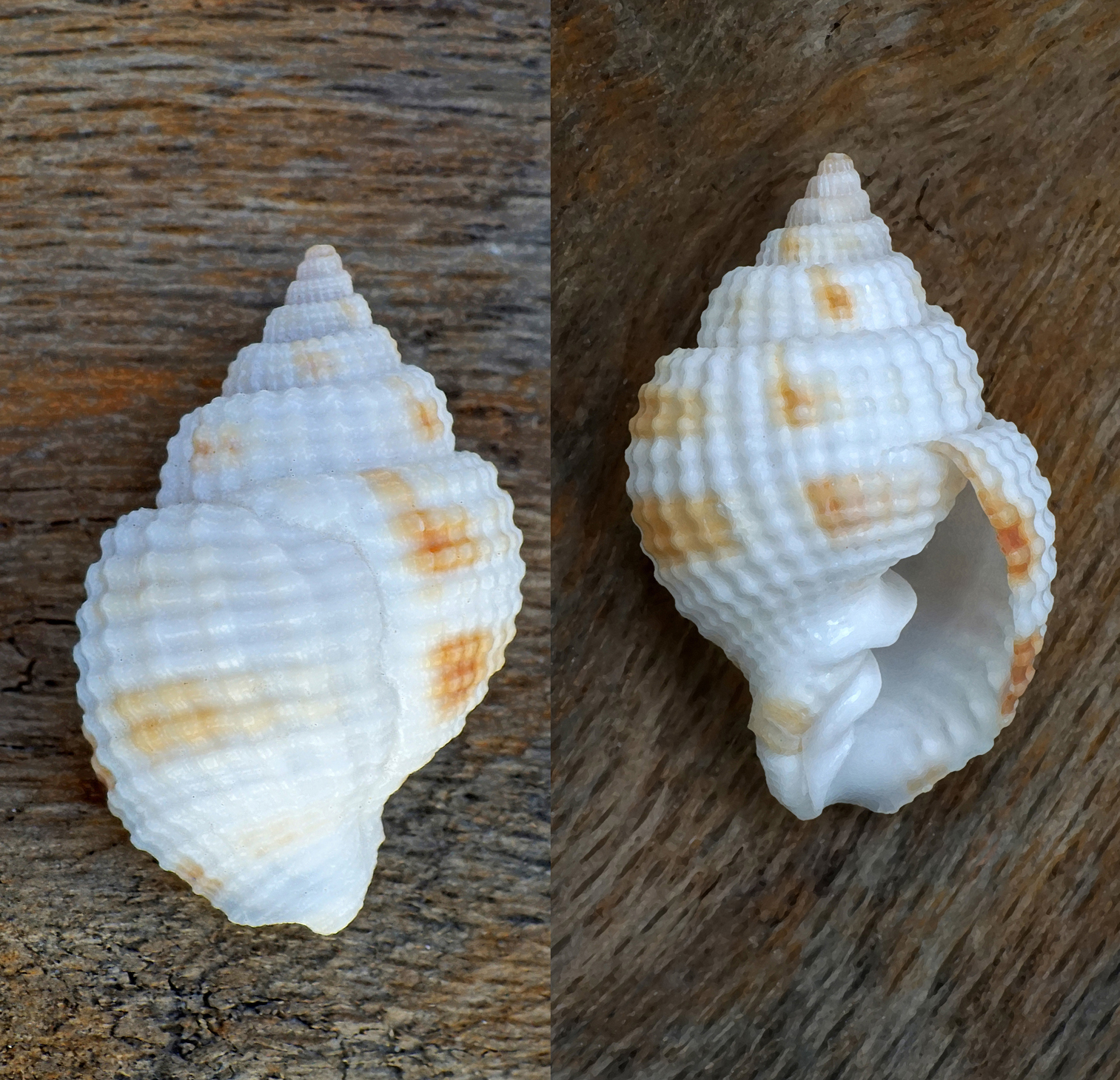 The Nutmeg Snail shell is small and resembles the shape of a nutmeg seed with the same roughness and texture, hence the name. The background is white with various shades of brown arranged in spiral beaded bands and longitudinal stripes. The apex displays several whorls coming to a point. Nutmeg snails are marine gastropods that uses a long, tubular snout to extract bodily fluids and soft tissues from other marine animals.