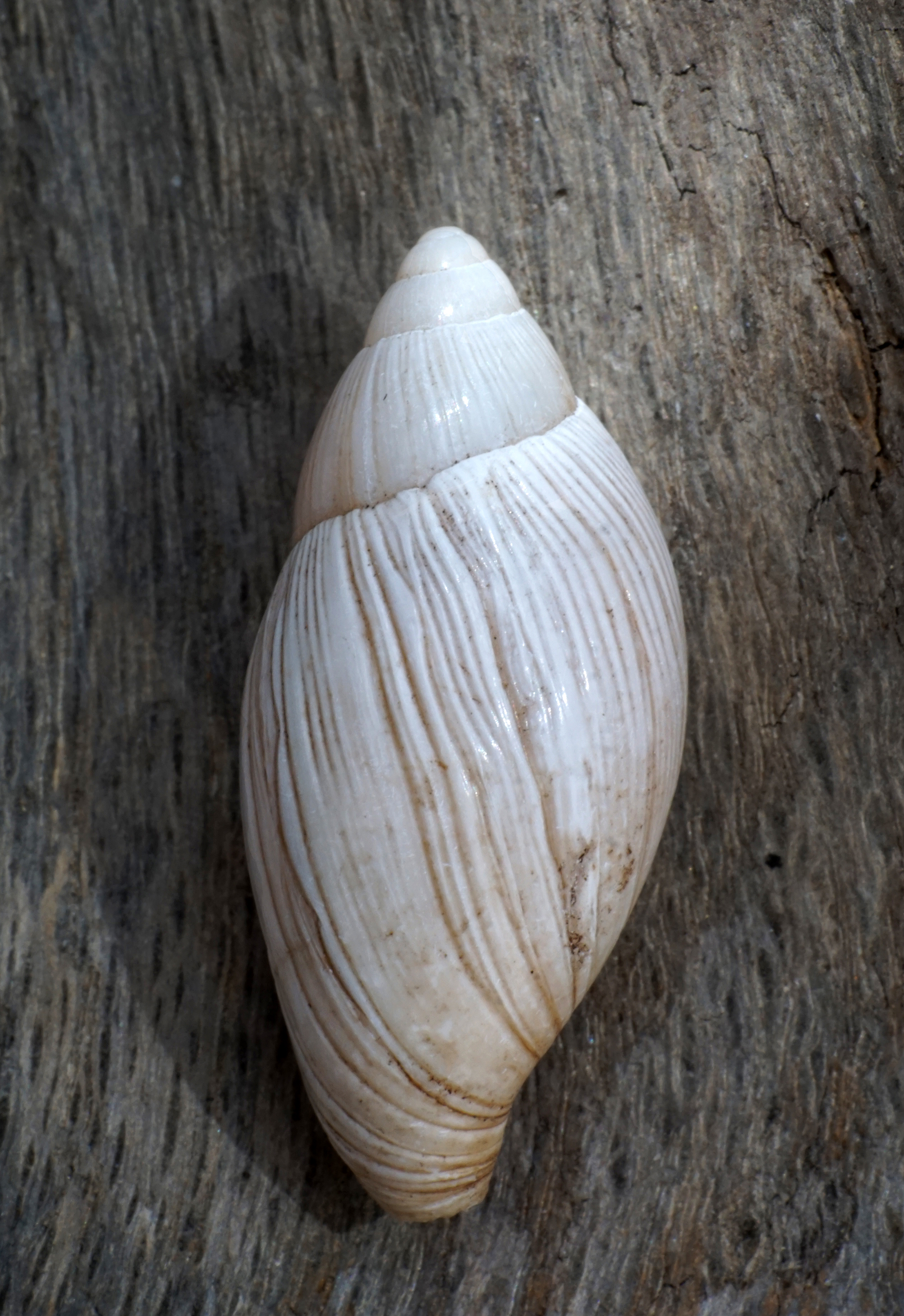 The family of Olive Sea Snails display shells that are typically smooth and shiny, except the one in my collection reveals thin brown groves over the exterior. The shells are typically bullet shaped coming to an apex point with three to five wide whorls. The bottom twists in my sample. The Olive Sea Snail family is large with many tropical species. Though, I am baffled about the specific species, it could be the purple olive sea snail (Callianax biplicata). While those are named for their frequent purple or violet tint, they are highly variable in color and can appear in shades of tan, grey, white, or light brown.