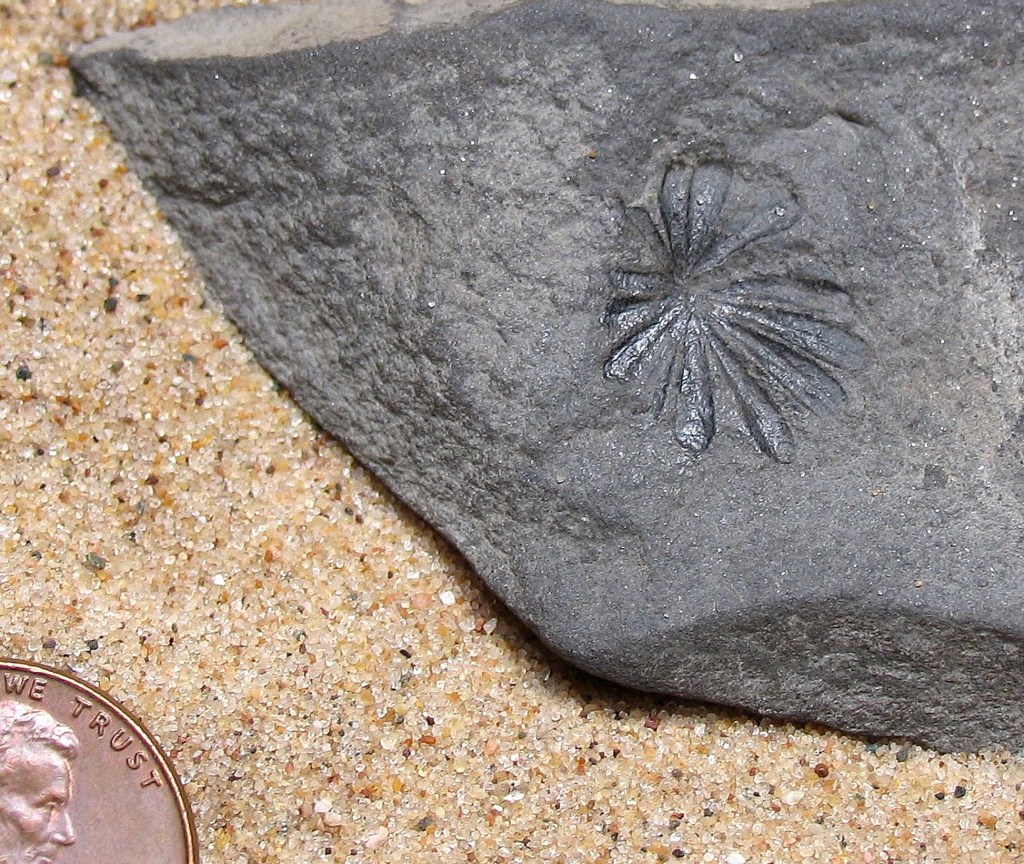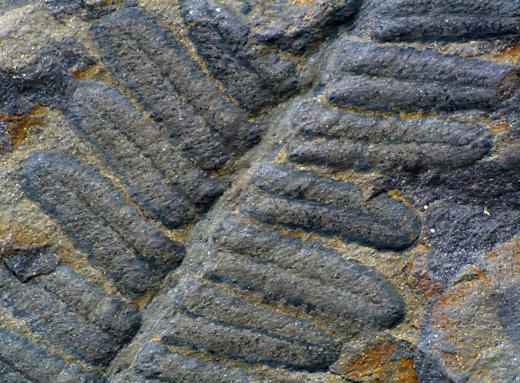 While the Petrified Forest of Arizona has the highest concentration of petrified wood in the world, it can be found in every US state and other countries around the world. I found this sample of petrified driftwood on a Southwest Michigan beach off Lake Michigan called Oval Beach. It’s predominantly gray with a slight bluish green cast and has a few streaks of rust. In certain light, it casts a very bright sheen or luster. It’s difficult to capture the sheen in a photograph, but you can get a better idea from its flip side in the photo below.