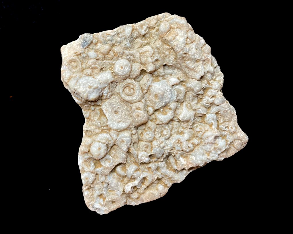 Limestone is a sedimentary rock composed mainly of the skeletal fragments of marine organisms such as corals, clams, or mollusks. Its major mineral contents are calcite and aragonite, which are different crystal forms of the compound calcium carbonate. Marine animals grow their shells by extracting calcium carbonate from the water, which is quite fascinating when you think about it! There are several types of limestone lying on the beaches of the Great Lakes. Below is a descripton of four types; Compact, Crinoidal, Fossiliferous and Tuffa Limestone!