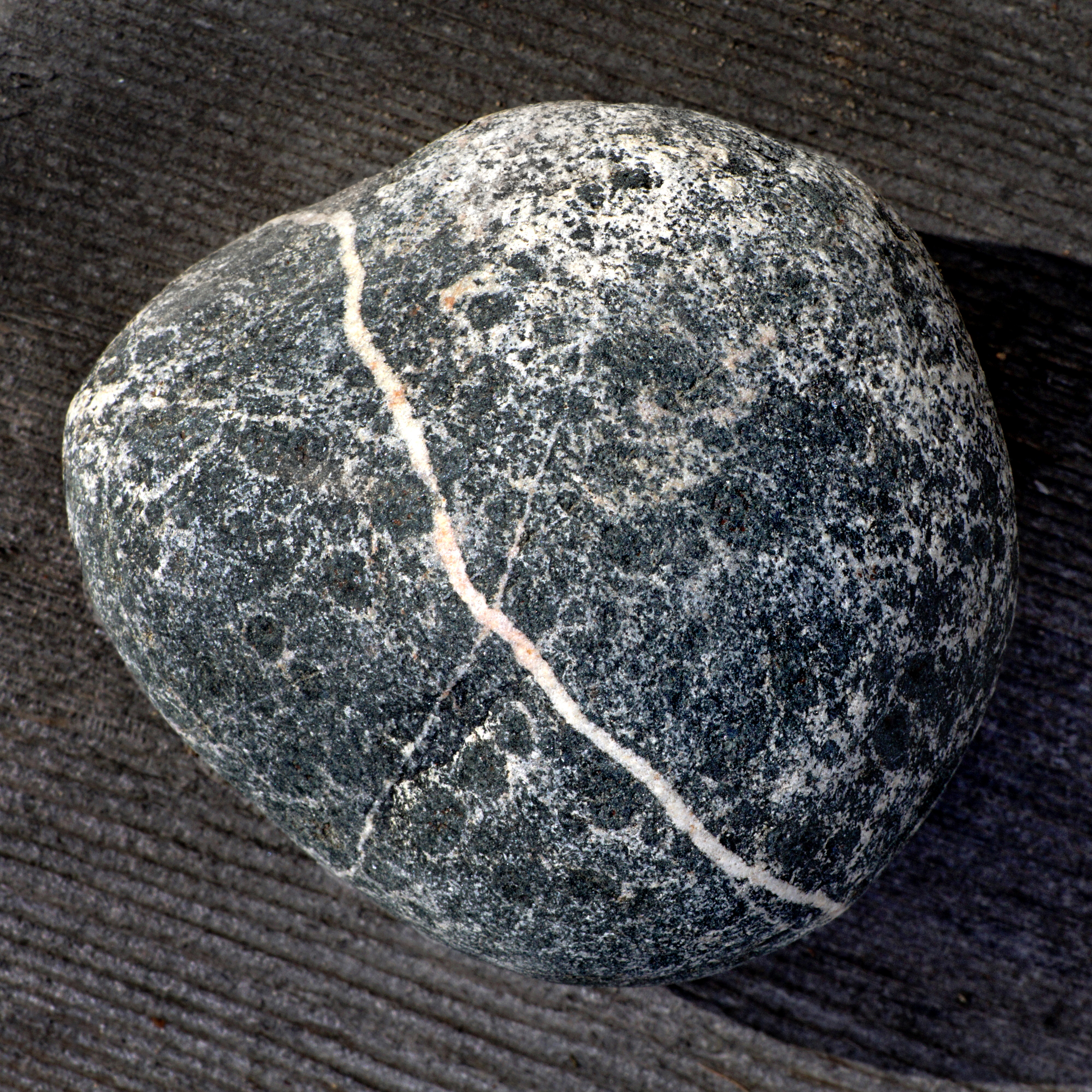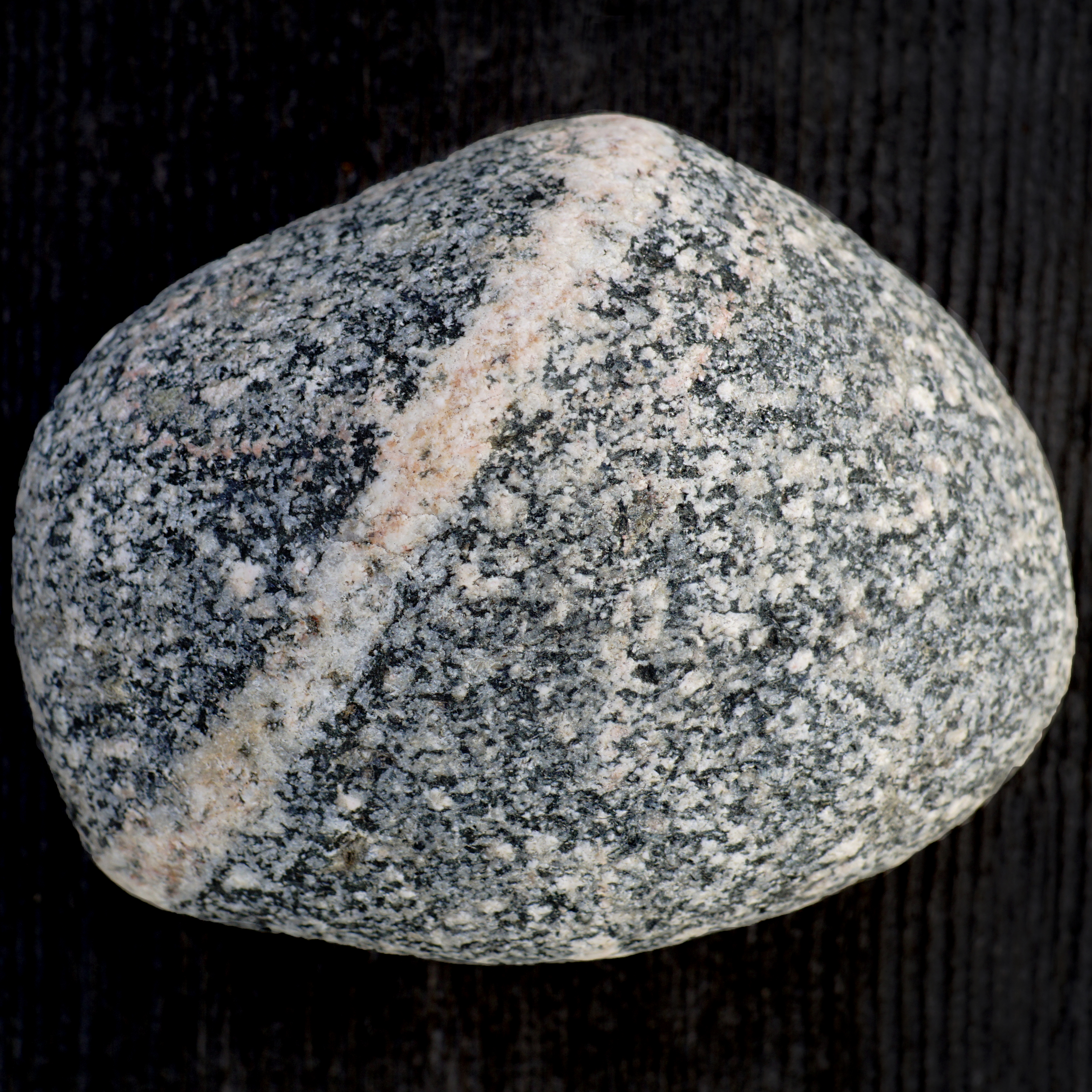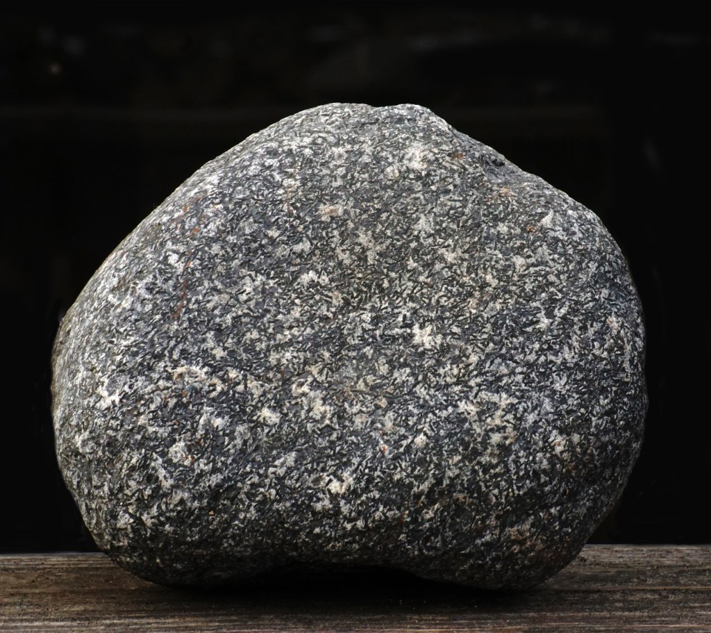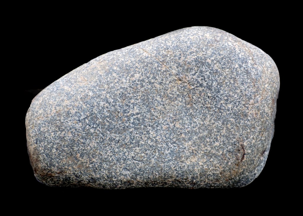 To indicate the mineral composition—or to make things even more complicated—pegmatite can be “granite pegmatite,” “gabbro pegmatite,” “syenite pegmatite,” and any other plutonic rock name combined with “pegmatite” are possible. My first beach stone sample reminds me of the salt-and-pepper grains contained in diorite, so it could possibly be “diorite pegmatite.” Note: I featured diorite, gabbro, and granite in another photo essay about beach stones, but will briefly explain them here.