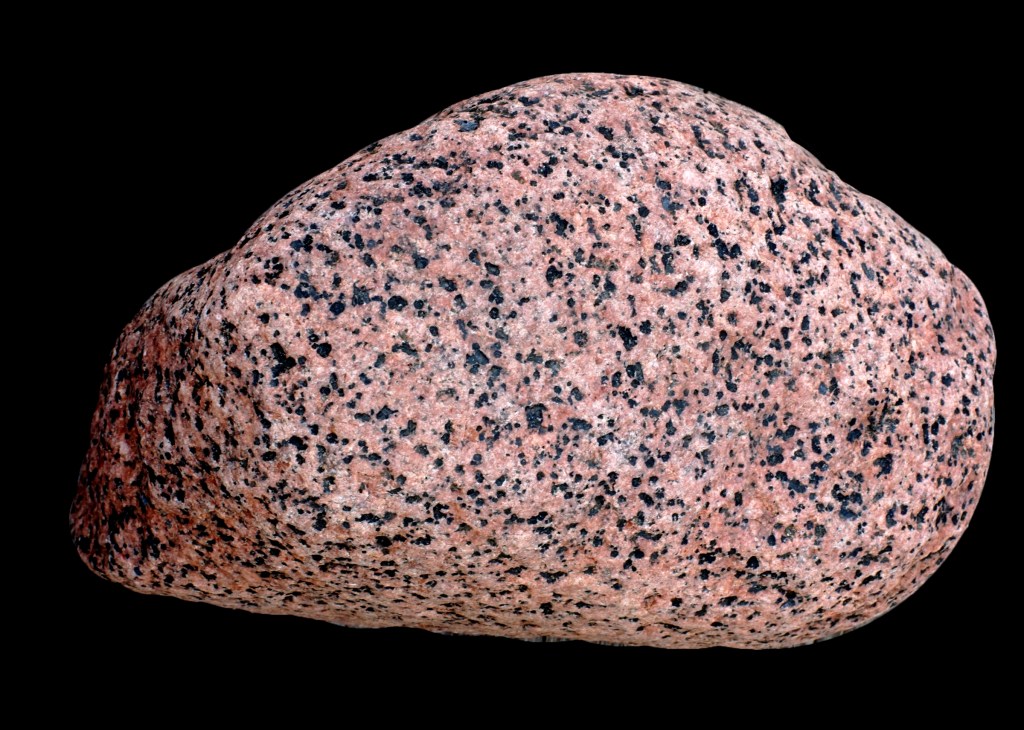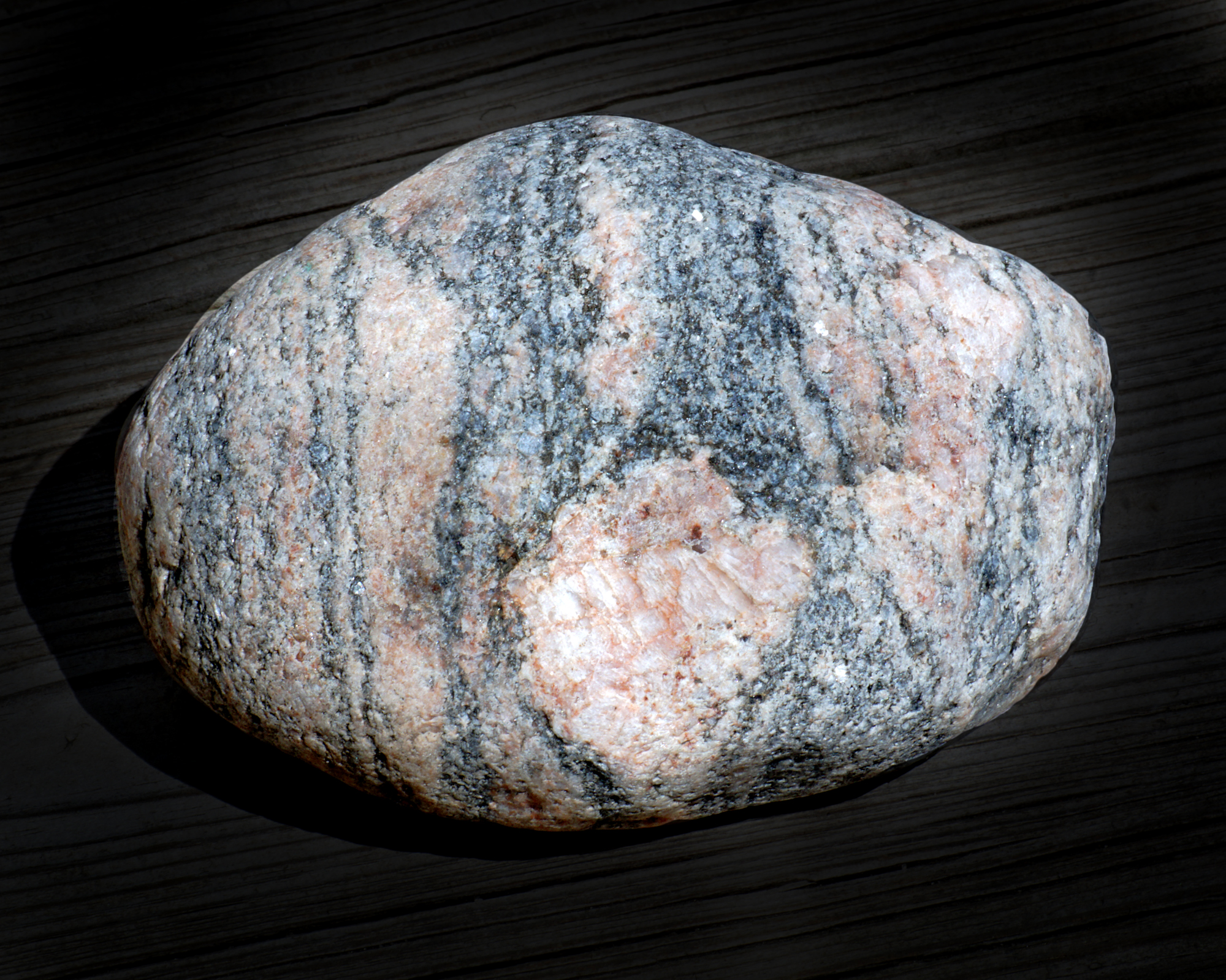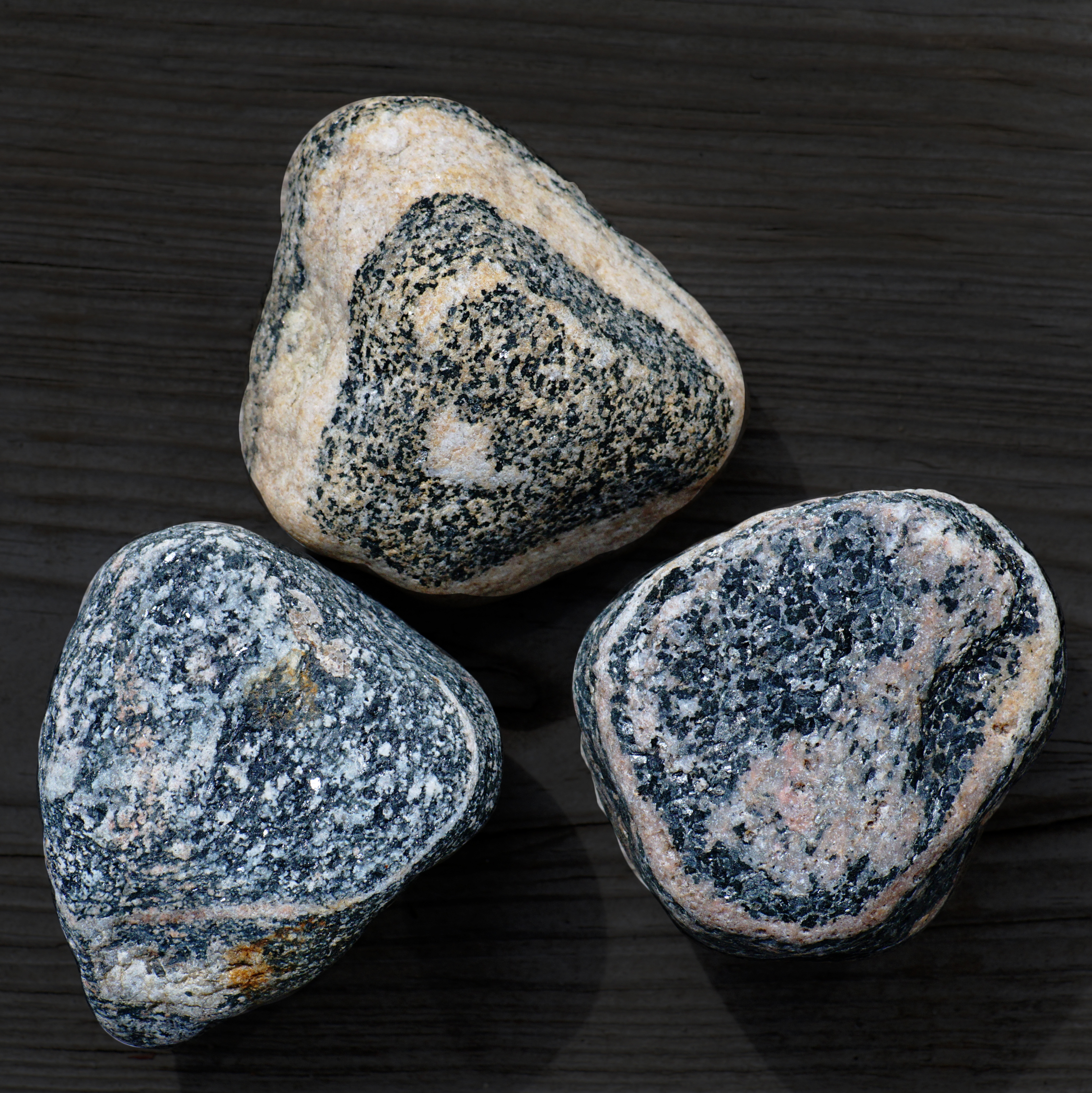 To indicate the mineral composition—or to make things even more complicated—pegmatite can be “granite pegmatite,” “gabbro pegmatite,” “syenite pegmatite,” and any other plutonic rock name combined with “pegmatite” are possible. My first beach stone sample reminds me of the salt-and-pepper grains contained in diorite, so it could possibly be “diorite pegmatite.” Note: I featured diorite, gabbro, and granite in another photo essay about beach stones, but will briefly explain them here.
