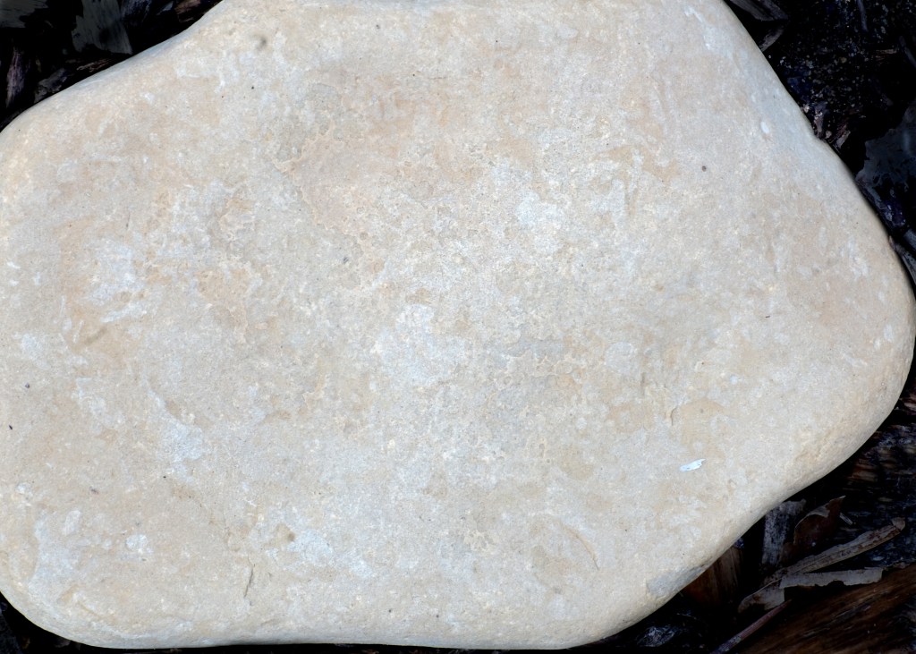 Compact limestone is composed primarily of tightly packed calcium carbonate derived from the remains of marine organisms. It can vary in color from white, yellowish, pinkish, red, gray, or even black, depending on the presence of other minerals. It has a very fine texture and is denser than other types of limestone. The first sample shown above is a large piece with rounded edges and has been flattened, hence the name “shingle” for flat stones found on beaches.