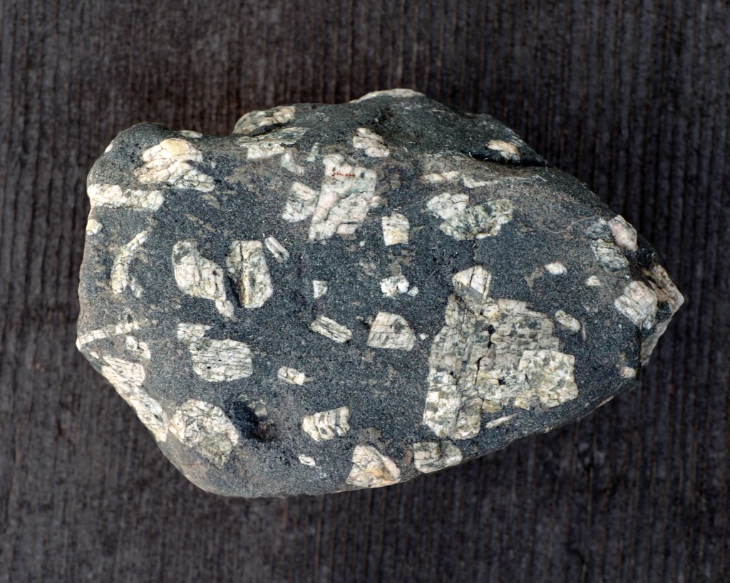 Most extrusive igneous rocks in Michigan were formed from ancient, quiet, lava flows which reached the surface through long cracks and crevices in the Earth’s crust; also, from remnants of mountain peaks that have withered away. Just imagine, when you find a basalt rock on the beach, you’re likely holding in your hand at least a billion-year-old chunk of Earth. Below is a brief description of four special types of basalt; Ophitic, Vesicular, Amygdaloidal and Porphyry.
