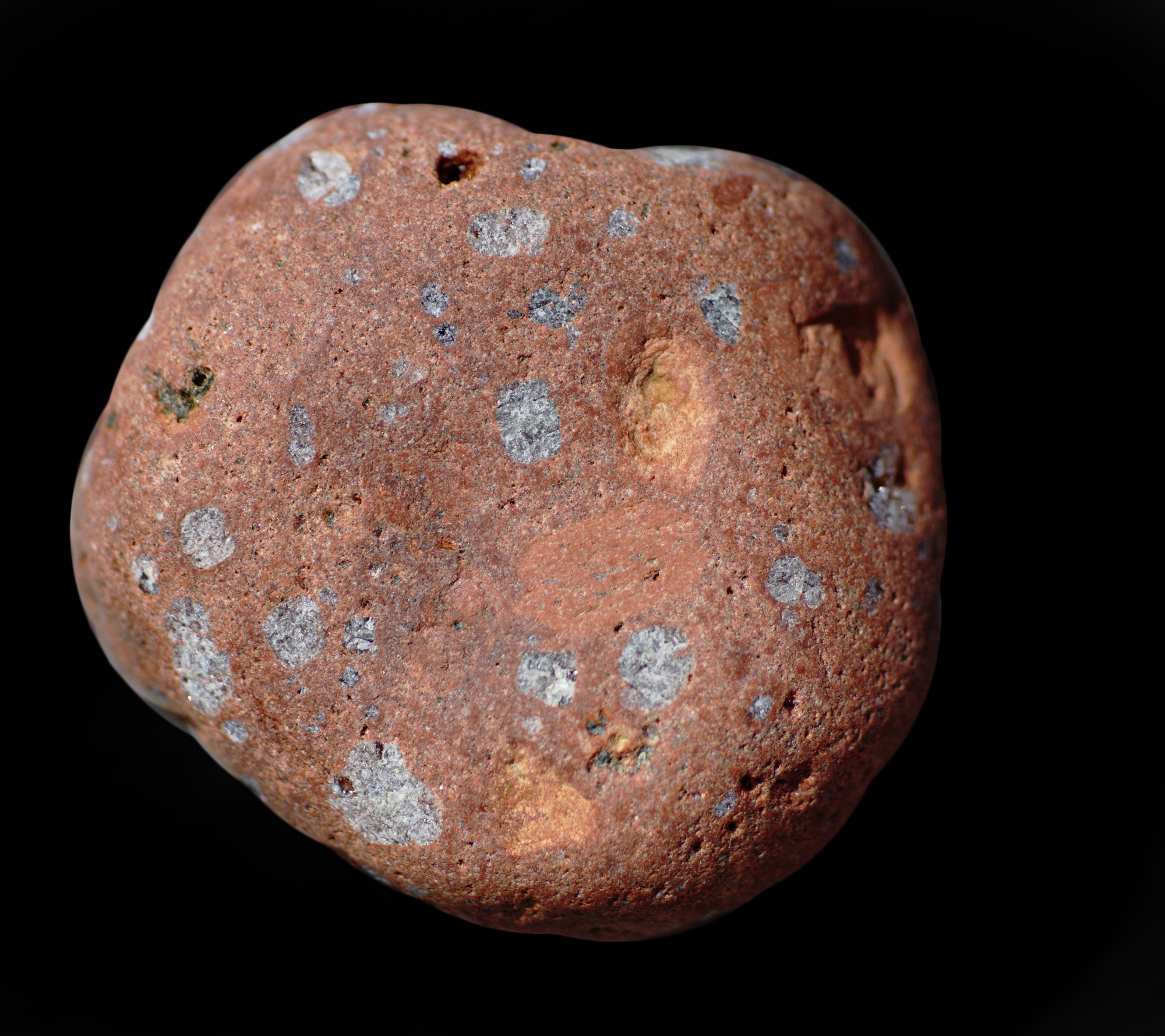 Jacobsville Sandstone, or Redstone, is generally red due to the presence of highly oxidized iron cement which binds together the grains of quartz. The stone is typically mottled with various pinks, whites, and browns, exhibiting either many streaks or spherical spots caused by leaching and bleaching. It forms a wide belt throughout Northern and Upper Michigan and was quarried rather extensively at one time for use as building material which built the cities of Northern Michigan and elsewhere in the Great Lakes region. As with many stones that formed northward in Michigan, the big lake brings them southward to where I find them in lesser amounts. Estimates for the age of the Jacobsville Formation Range is in the late Mesoproterozoic Era about 1.05 billion years ago until the Middle Cambrian Period.