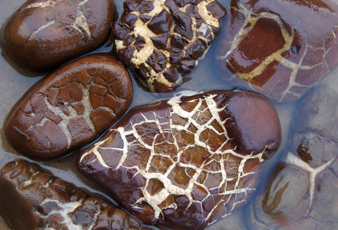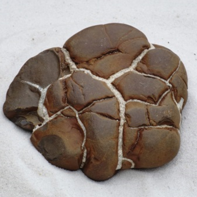 Interesting how they formed; around 50 million years ago, iron-rich mud and clay formed over a shallow ocean floor that covered much of Michigan and other territories of the USA.  At some point, the water receded drying out the muddy substrate giving way to cracks and fissures. Later, calcite infiltrated the open veins via ground water and gradually filled them in. Then some time after that, pieces broke apart most likely caused by the ice glaciers that scraped and ripped the bedrock. Geologist now identify the rock pieces as Septarian Stones or Septarian Brown Stones.