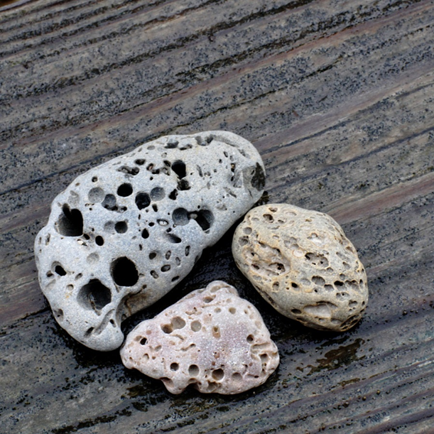 Occasionally, we find these most-curious pitted stones on the beaches. After some research, I finally understand how they got that way. They are called “vesicular basalt,” which means basalt with textures, and if the deep pits (vesicles) cover more than half the surface of the rock, it’s called scoria. What causes the vesicles or pits in the rock? The basalt-making molten rock cools down quickly before gas bubbles from deep inside Earth’s surface have the chance to make their way out. When the lava reaches the atmosphere, the bubbles inside can blow out, leaving spherical-pitted impressions.