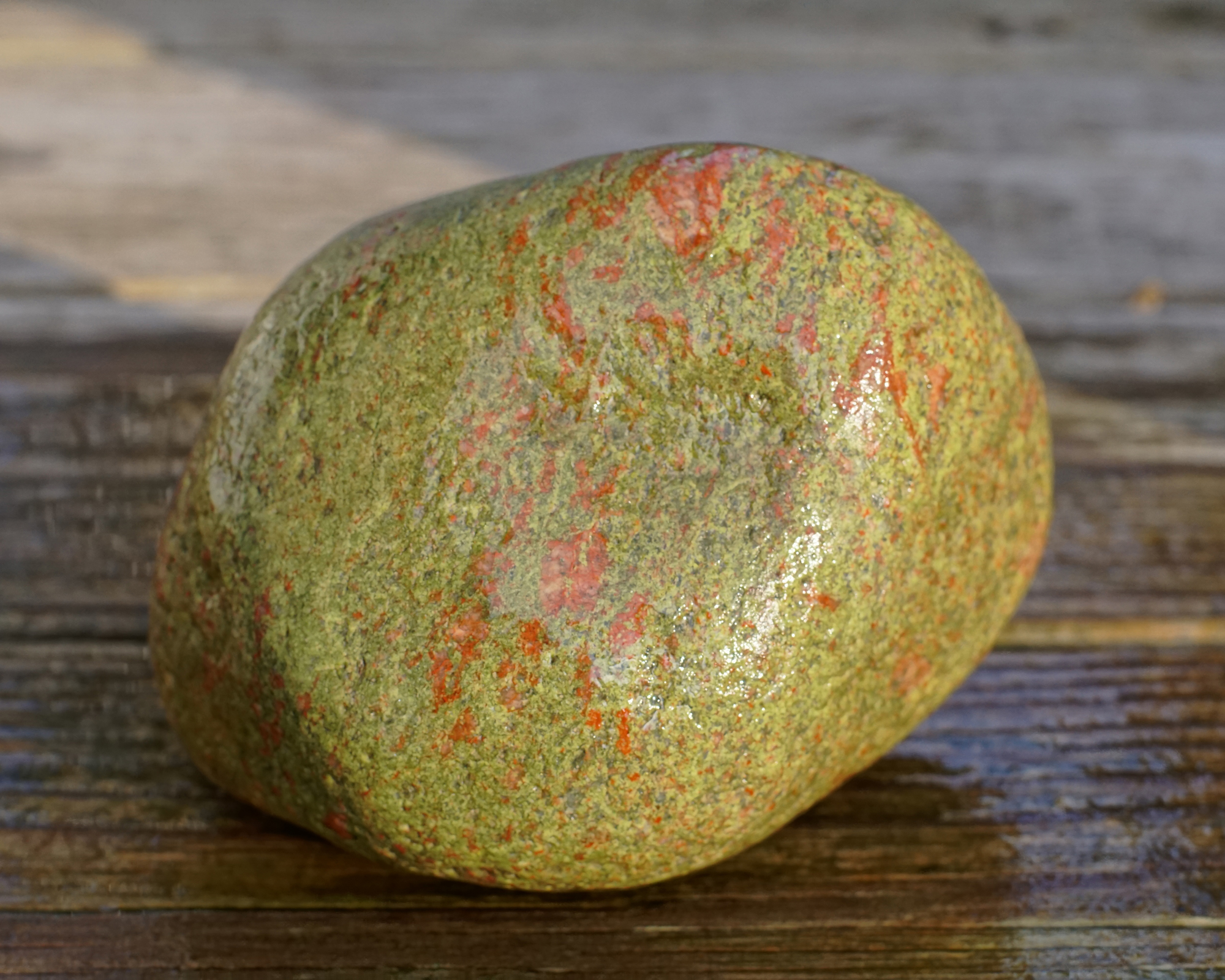 Unakite is a metamorphic rock of granite with a mixture of pink orthoclase feldspar and transformed plagioclase feldspar into the green mineral epidote; it may or may not also contain quartz. Another name for it is Epidote Granite. It has mistakenly been called Unakite Jasper, but jasper is a form of quartz colored by iron oxide inclusions. Some Unakite will show pinkish-orange toned inclusions as the Feldpar has turned darker than the salmon-pink you may see in other pieces. Sometimes you will see litttle to barely visible green Epidote in Orange Unakite.